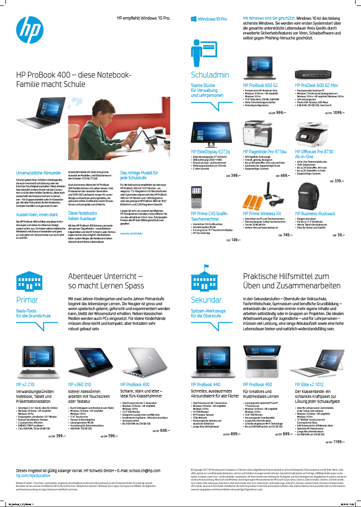 Technologie kann ein nützliches Werkzeug fürs Lehren und Lernen sein. HP bietet seit 2001 in allen Schulbereichen passende Produkte zu attraktiven Edu-Preisen: Leistungsstarke PCs für Schüler, Lehrpersonen und die Schuladministration sowie alles für eine zuverlässige Netzwerk- und Serverumgebung.
