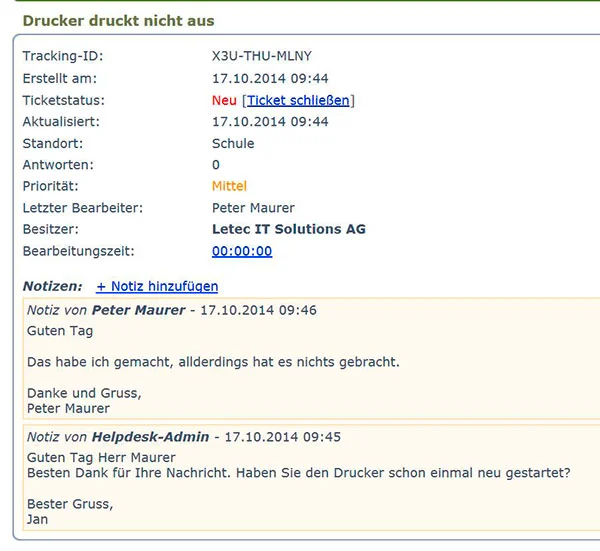 Die Letec Ticketing-Lösung erfasst die Supportanfragen aller Lehrpersonen einfach und zentral und weist diese automatisch Ihrem IT-Verantwortlichen zu. Die Benachrichtigung erfolgt per E-Mail. Der Verlauf aller Arbeiten ist ersichtlich, wenn nötig schickt der IT-Verantwortliche den Fall an die Spezialisten der Letec weiter.